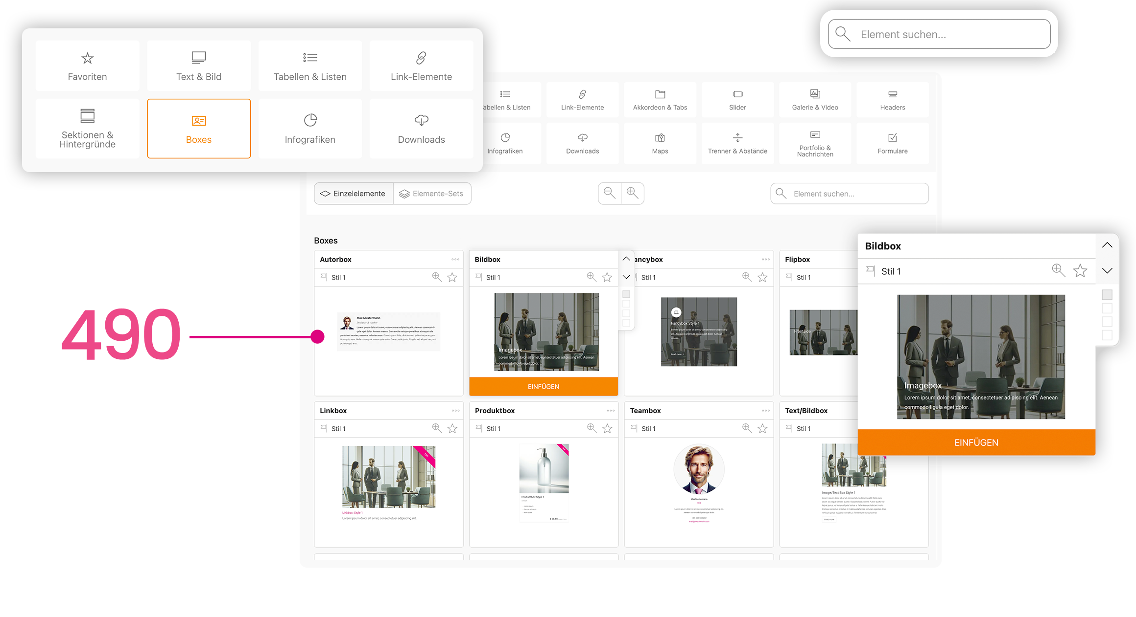 See in Backend how your elements look before you use them. 490 elements, super organized!